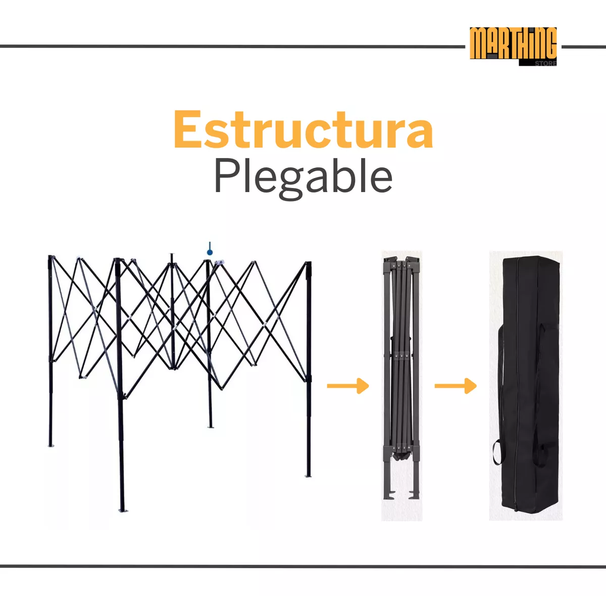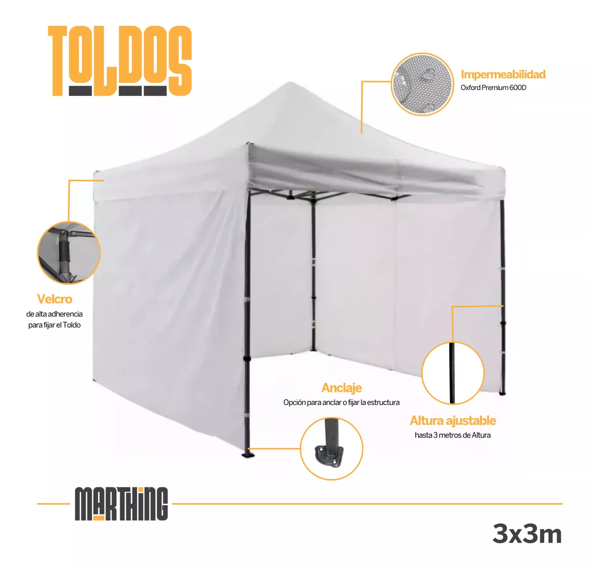 La carpa toldo plegable Marthing TE3X3 es perfecta para proteger tus eventos y actividades al aire libre. Con un tamaño de 3x3 metros, lona impermeable en techo y paredes y una estructura de acero reforzada, ofrece durabilidad y protección contra el sol y la lluvia. Su diseño plegable facilita llevarla y guardarla. Es la solución ideal para jardines, xferias, camping y reuniones sociales, combinando calidad y practicidad en un solo producto.