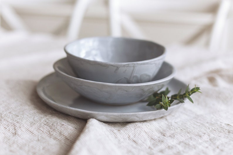 Looking for a handmade ceramic dinnerware set? Buy this pottery dinner set of 3 online and get free shipping worldwide. Concrete grey stoneware dinnerware set for one person consists of a dinner plate, soup bowl, and pasta bowl. All Mr. Bowl Ceramics dinnerware is made to order and made especially for you. We believe every item should be made on purpose. Just imagine that as soon as we get your order, we start building every dish from scratch, putting in all our love and passion. Every plate and bowl will be touched millions of times during the whole process, carefully build, and made unique and special. While we will be working on your dishes, we encourage you to sit on your couch, take a sip of your favorite drink, relax and start building your dinner of a dream, because when you get your dishes, you will definitely feel a need to have special occasions with your beloved ones more often. Because you ordered not just a dinnerware set, you bought a new family tradition of being together - you bought time for yourself, your family, and friends! ♥