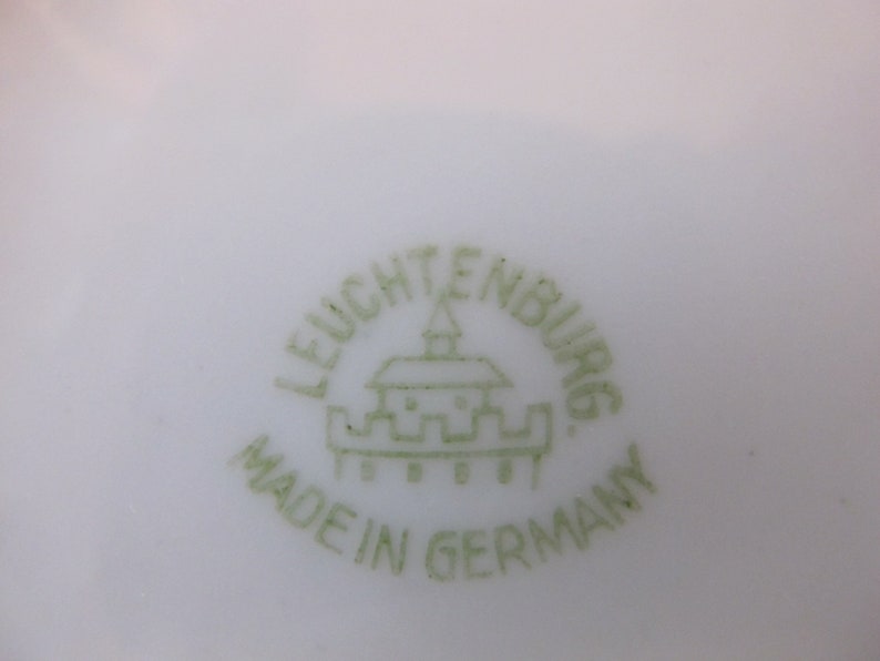 Fine lustrous and ornate porcelain serving pieces made by Leuchtenburg in Germany between 1920 and 1935. The pieces are painted with flowers, roses, dark pink and pale pink with their green foliage. They are also decorated with golden floral motifs. The borders are scalloped and are accented with shaded pale green.