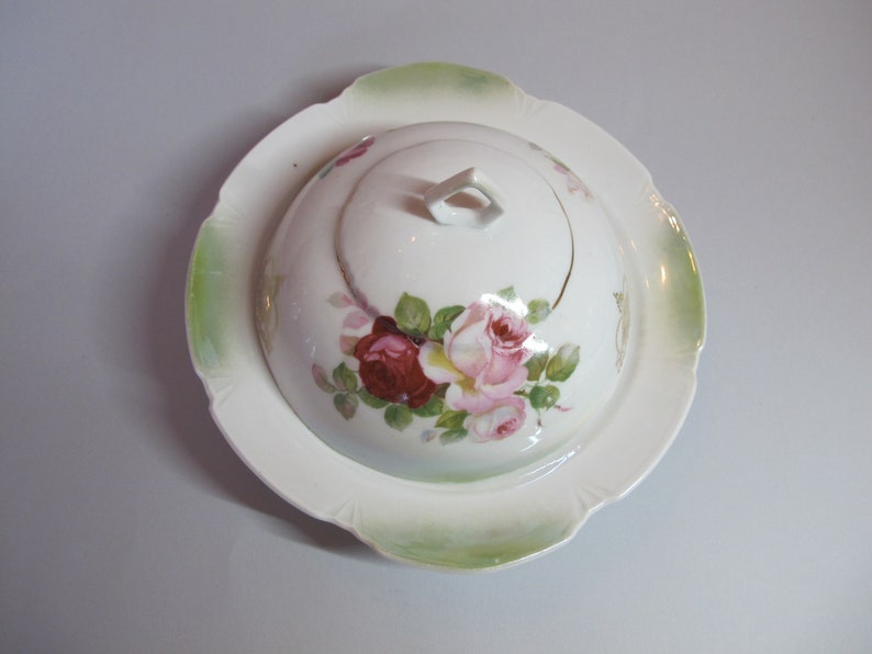 a serving dish (a butter dish) with inner plate with lid (dome); the dish measures 7.75 inches (19.68 cm) in diameter and 1.75 inches (4.44 cm) in height; the plate measures 3.75 inches (9.52 cm) in diameter. The height of the dish with the dome is approximately 5 inches (12.7 cm) (the diameter of the dome is 5.5 inches)