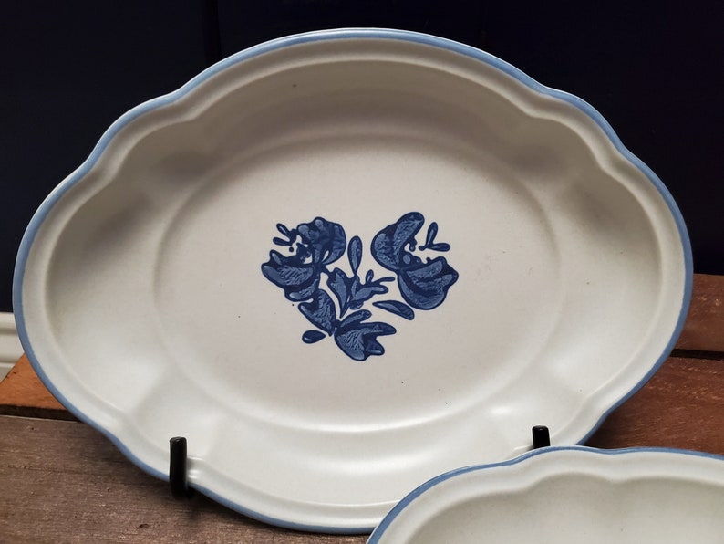 This set of 2 oval relish dishes is in Pfaltzgraff's classic pattern, Yorktowne. These microwave and oven safe dishes feature a grey background with the dark blue Yorktowne design in the center and the dark blue rim.